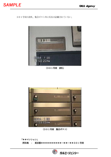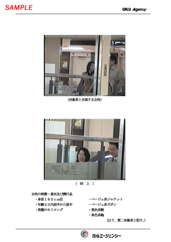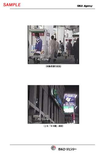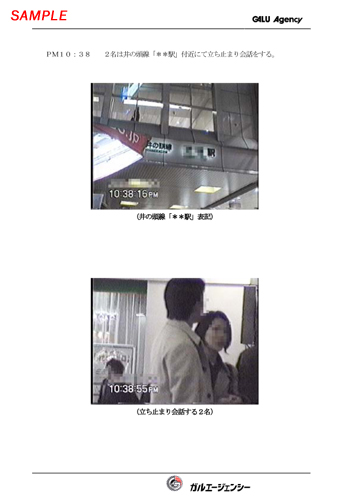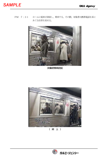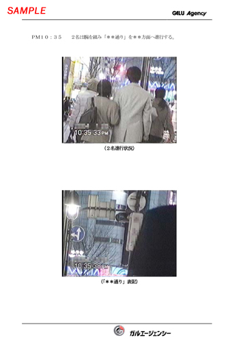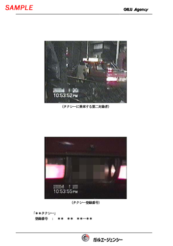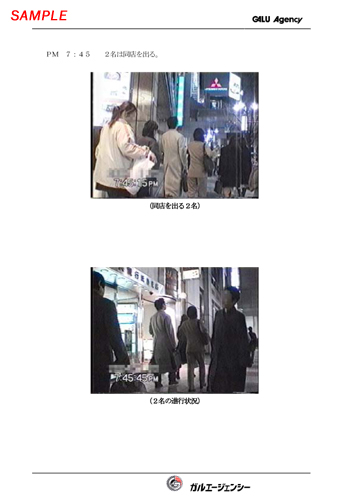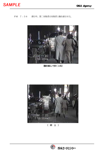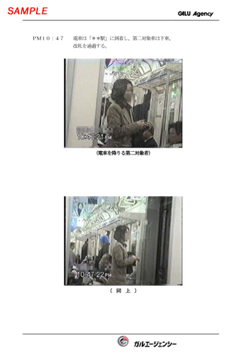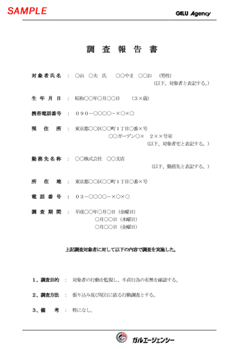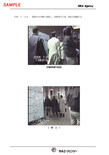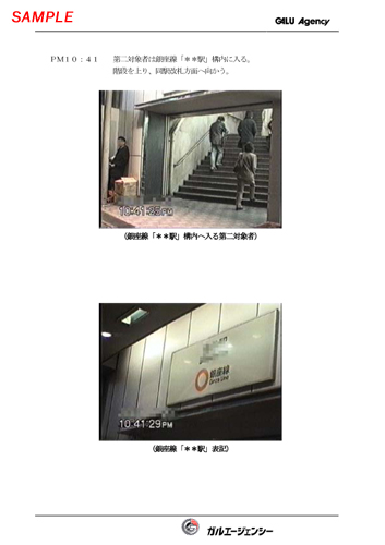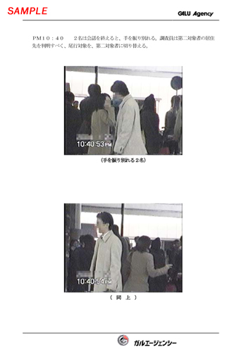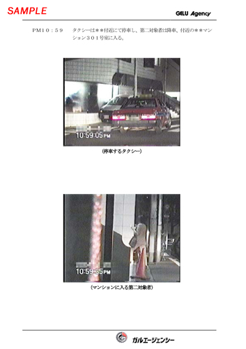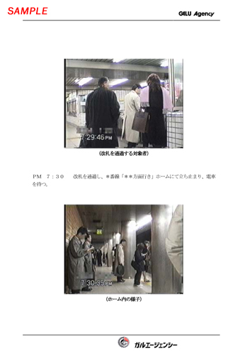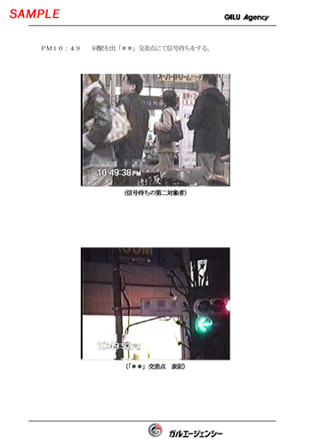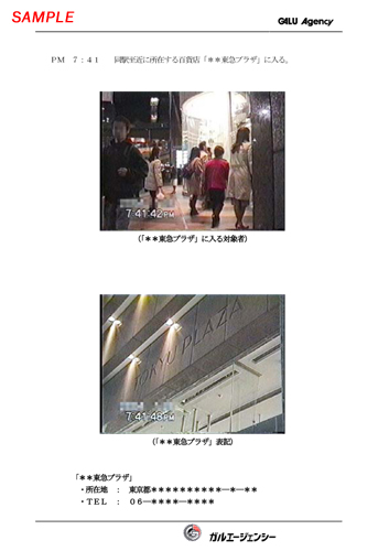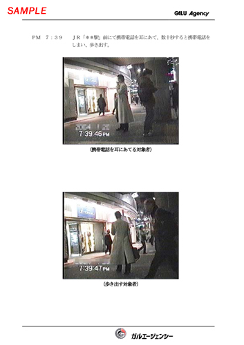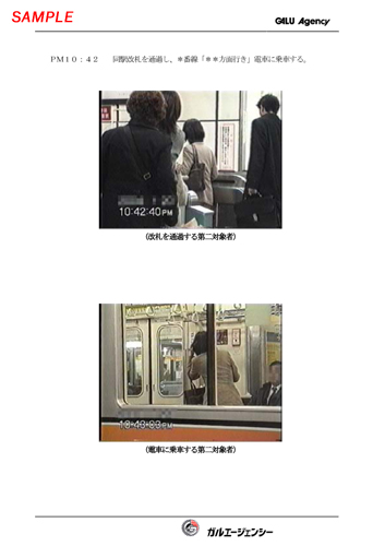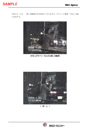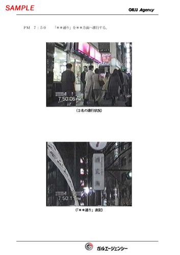 調査が完了しましたらご報告書をお渡しいたします。 私たちの唯一の商品になるのがこういった報告書なのです。 報告書は以下の様な書式で写真、時間、取った行動、場所や地図、人物の特徴などを細かく記述しています。